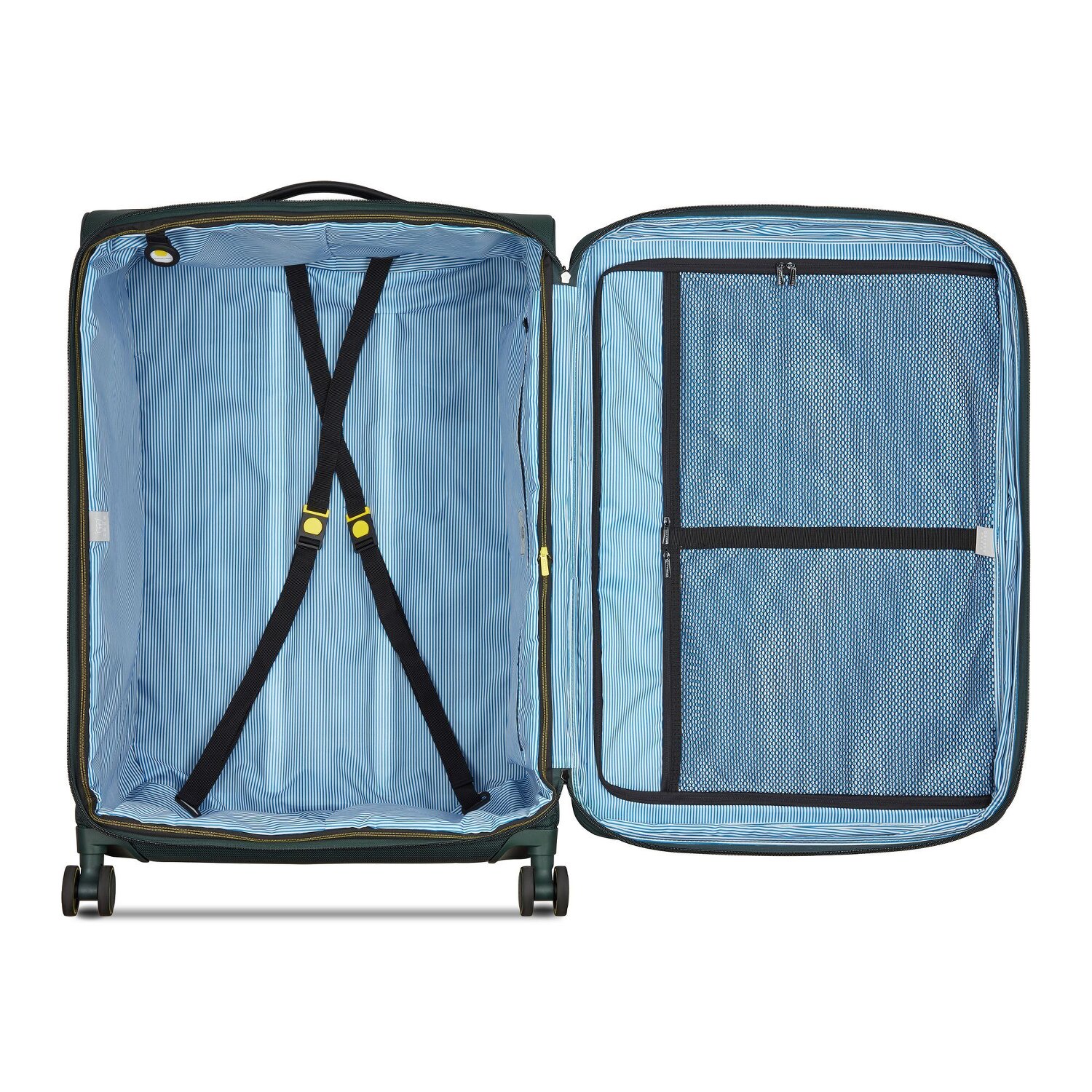- Ausstattung: Wäschefach, Tasche(n) außen, Netzfach, Kreuzpackgurt, Dehnfalte, arretierbarer Griff