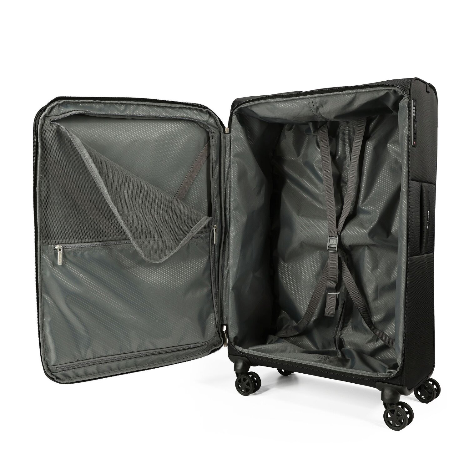 - Ausstattung: Wäschefach, Tasche(n) außen, Reißverschlussfach, Kreuzpackgurt, Dehnfalte, arretierbarer Griff