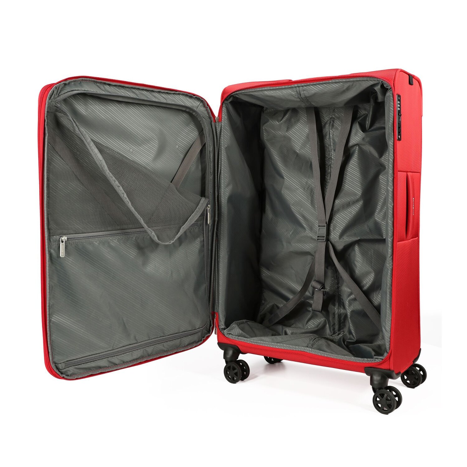 - Ausstattung: Wäschefach, Tasche(n) außen, Reißverschlussfach, Kreuzpackgurt, Dehnfalte, arretierbarer Griff