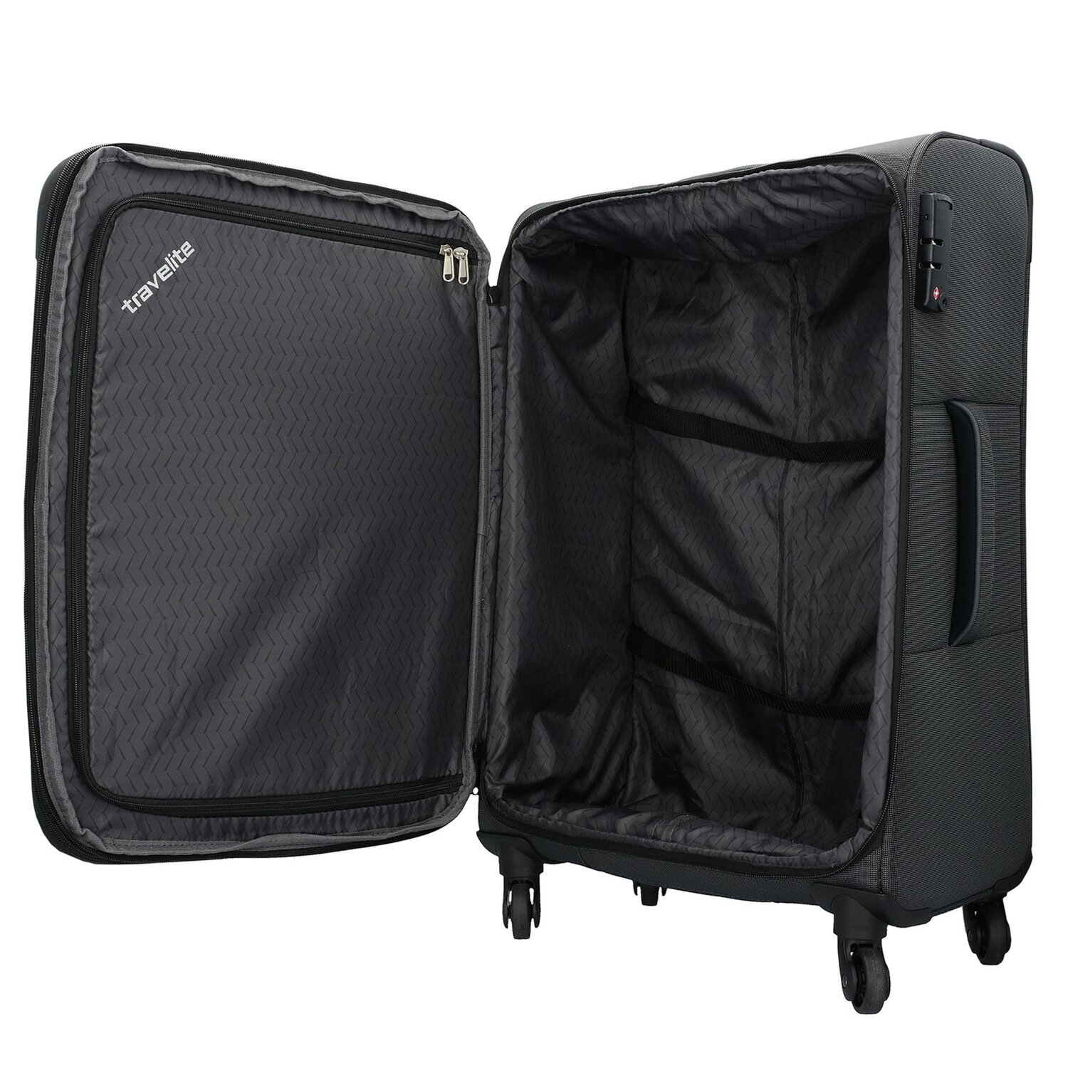 - Ausstattung: Wäschefach, Tasche(n) innen, Reißverschlussfach, Kreuzpackgurt, arretierbarer Griff