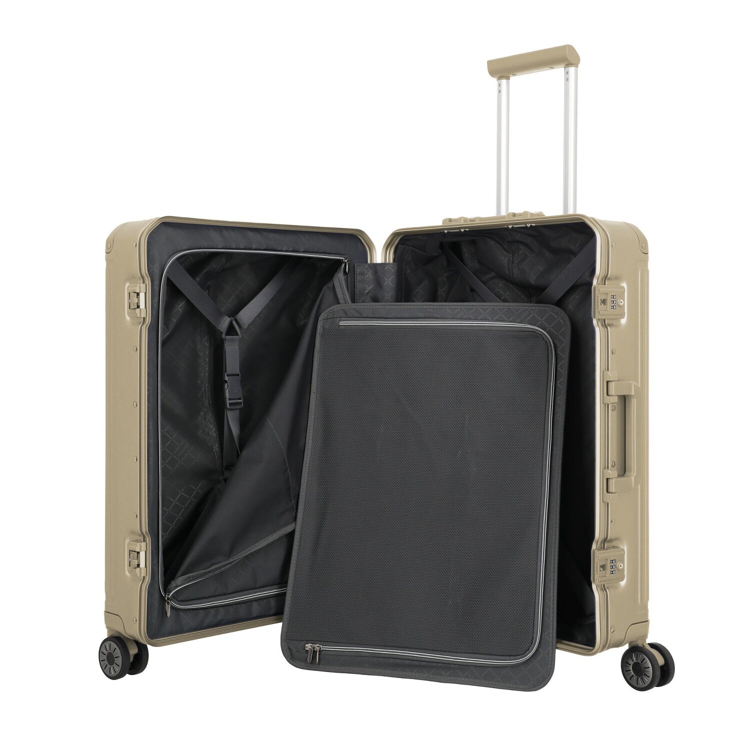 - Ausstattung: Trenn-/Packplatte, Reißverschlussfach, Netzfach, arretierbarer Griff
