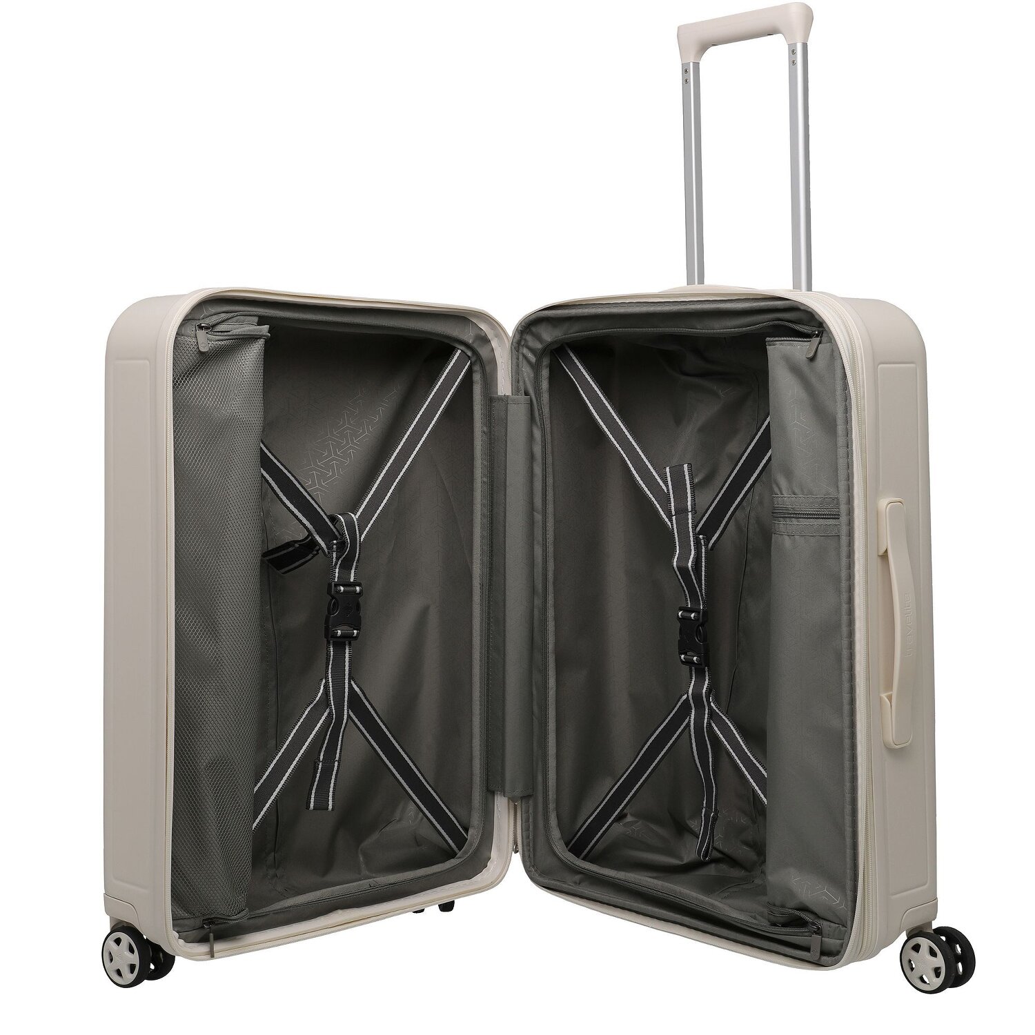 - Ausstattung: Wäschefach, Reißverschlussfach, Netzfach, Kreuzpackgurt, arretierbarer Griff