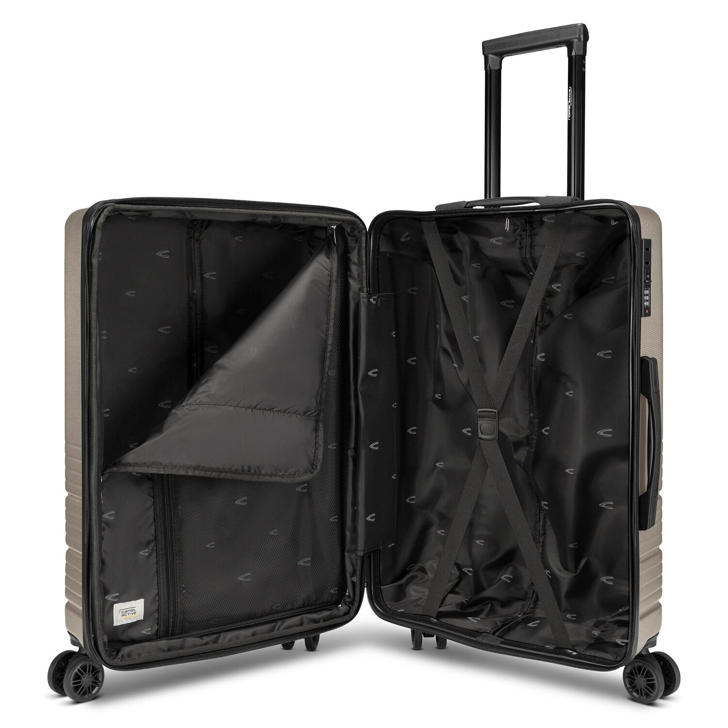 - Ausstattung: Wäschefach, Reißverschlussfach, Kreuzpackgurt, Dehnfalte, arretierbarer Griff